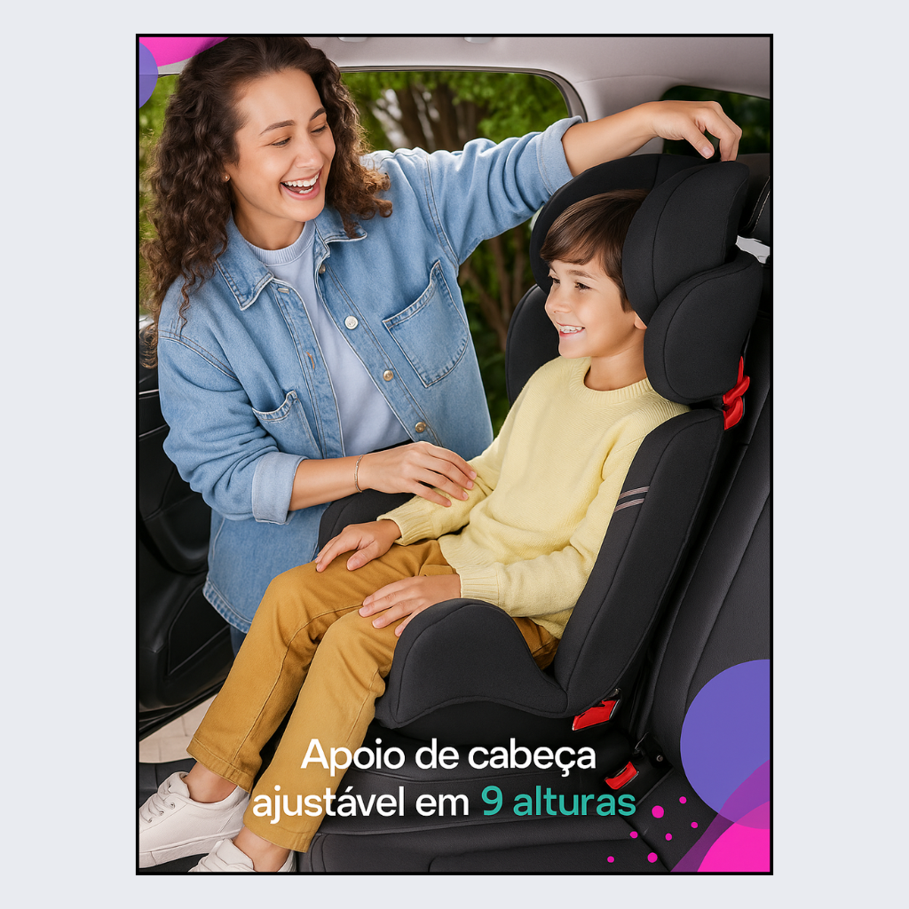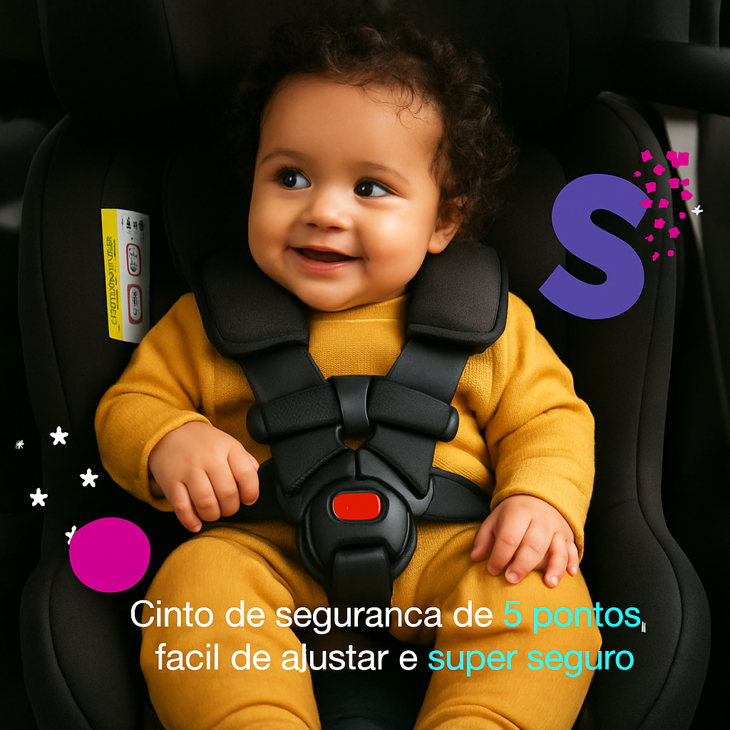 Seu revestimento é feito com tecido macio e super acolchoado, incluindo uma almofada redutora removível para maior conforto. A capa é lavável à máquina, facilitando a manutenção e higiene do produto. O cinto de segurança de 5 pontos, junto com o apoio de cabeça ajustável em 9 posições, assegura a proteção ideal para a criança.