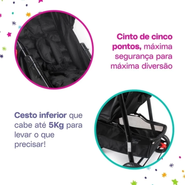 O assento é reclinável em múltiplas posições, incluindo o modo “berço”, ideal para momentos de descanso. Além disso, o apoio para os pés é ajustável, acompanhando o desenvolvimento do bebê com conforto. O cinto de segurança de 5 pontos, ajustável em altura e largura, assegura proteção e estabilidade.