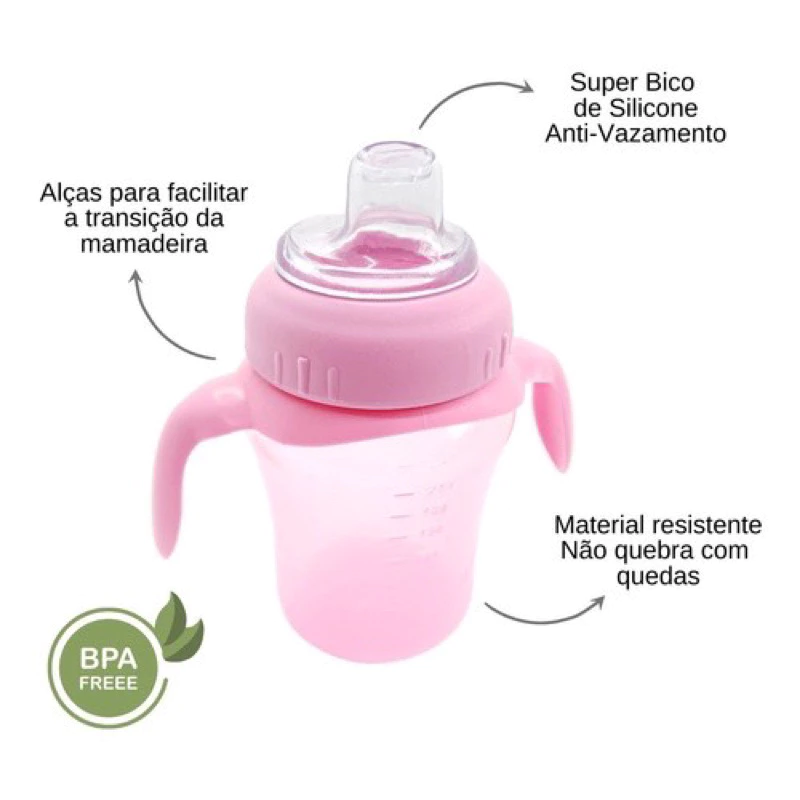 O Copo para Bebê com Bico de Silicone Antivazamento é ideal para auxiliar na transição da mamadeira para o copo de forma segura e confortável. Fabricado em material livre de BPA, possui bico macio de silicone que não machuca a gengiva do bebê e sistema antivazamento que evita sujeiras durante o uso.